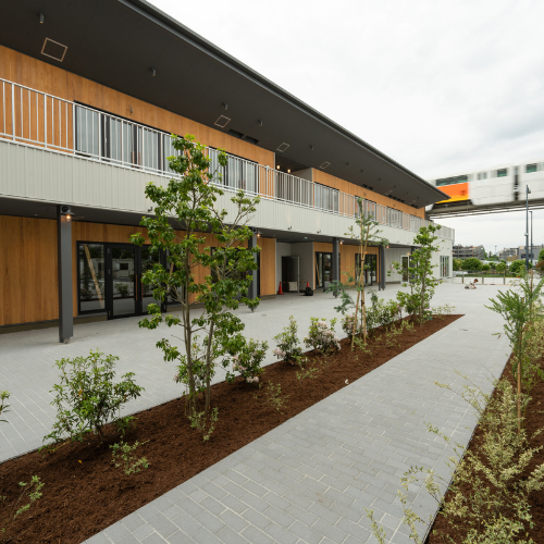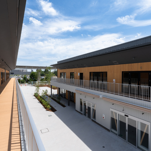 構造材の大部分を国産材・多摩産材とすることにより、森林資源の健全な循環に大きく寄与し、普及が見込める経済的なプロトタイプを目指しています。前面の都道を通る車や歩行者からも見えやすく、利用者が歩く通路からも目立つ外壁において積極的に多摩産材を利用し、木造らしさを表現しています。