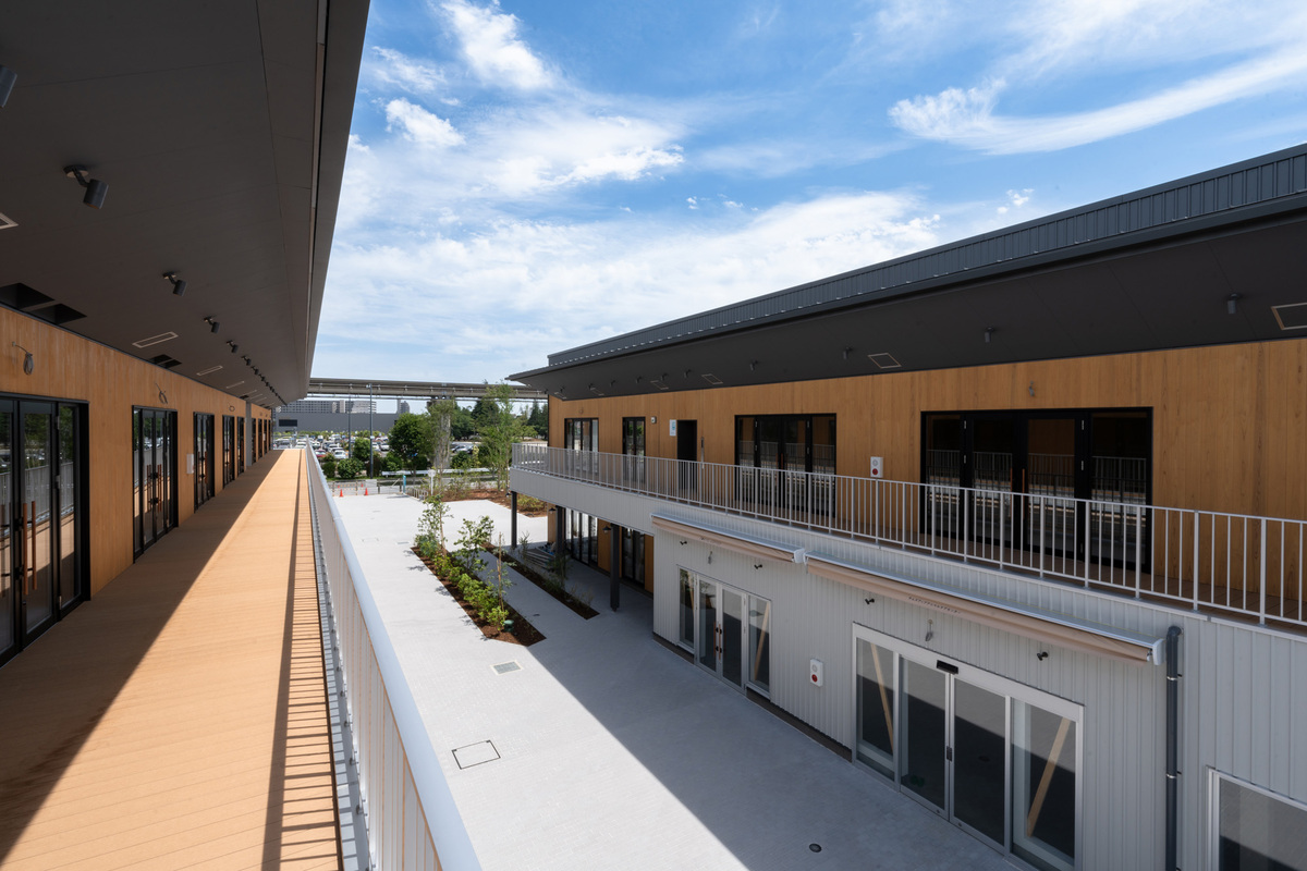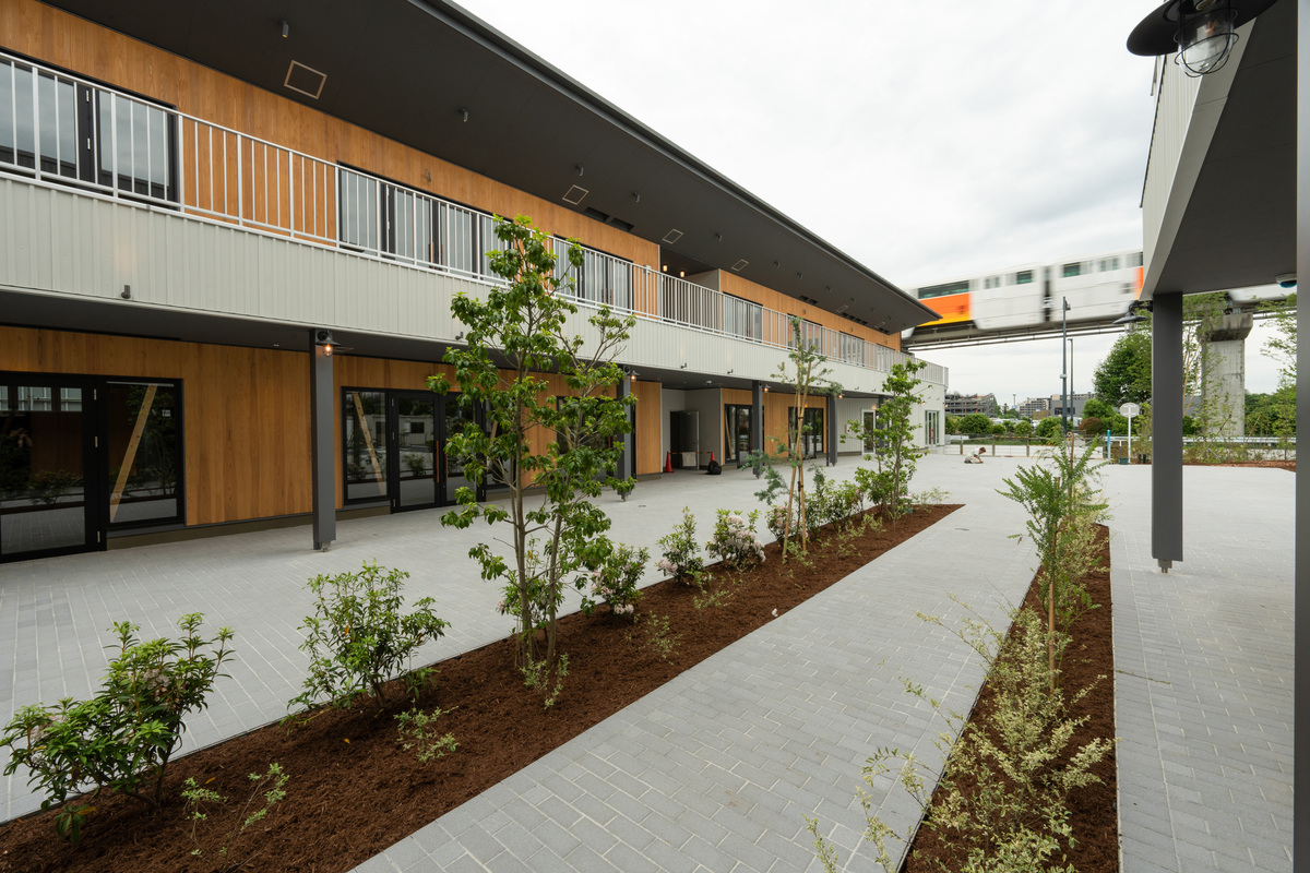 構造材の大部分を国産材・多摩産材とすることにより、森林資源の健全な循環に大きく寄与し、普及が見込める経済的なプロトタイプを目指しています。前面の都道を通る車や歩行者からも見えやすく、利用者が歩く通路からも目立つ外壁において積極的に多摩産材を利用し、木造らしさを表現しています。