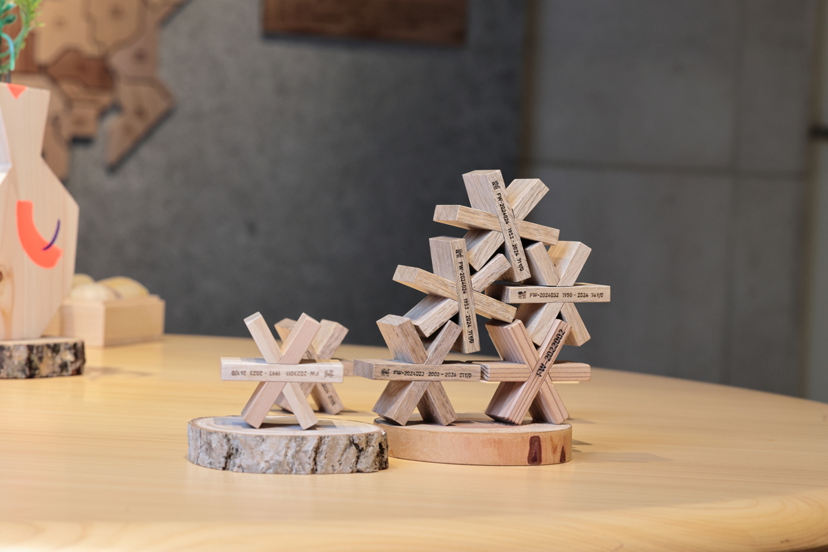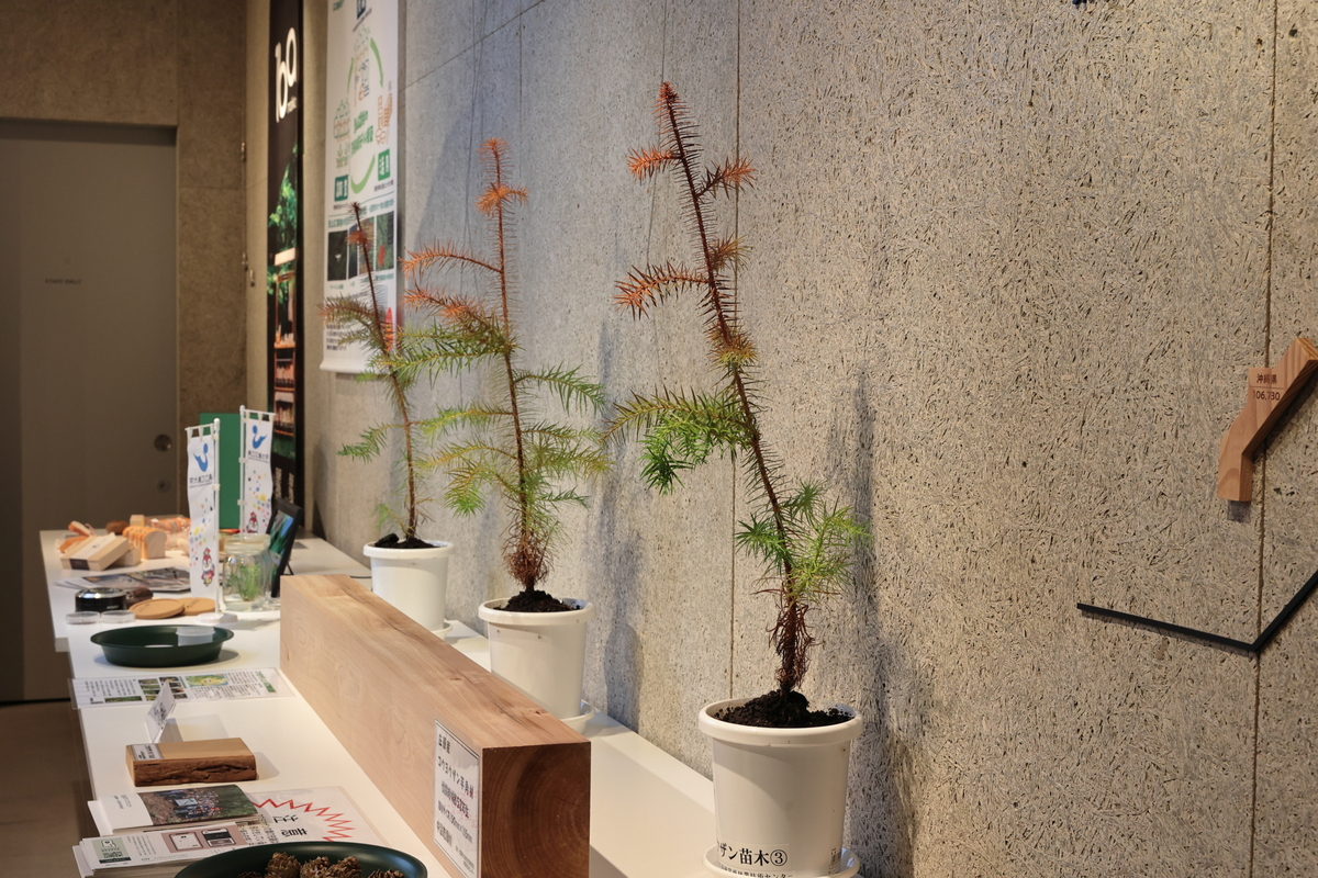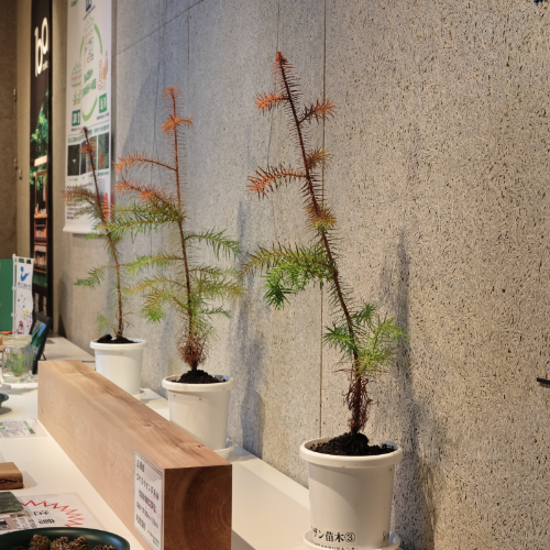 市内外の事業者による木材利用例の展示、コウヨウザンの球果、培養苗の展示等