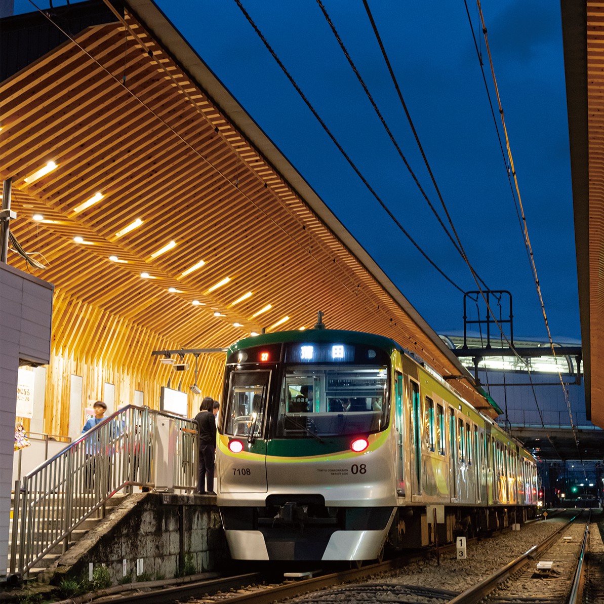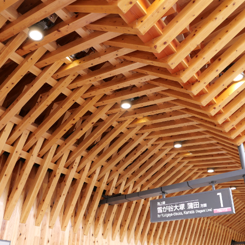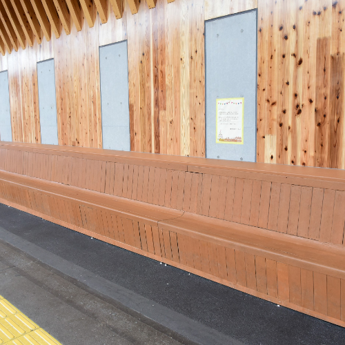 木のぬくもりを感じることができる駅として地域の皆様から愛されてきた駅を、東京都内の鉄道施設としては初めてとなる CLT(CrossLaminated Timber)を採用し、あたたかみのある駅とCO2排出削減や二酸化炭素固定化効果にも寄与するリニューアルとしました。また、木造駅施設の解体材を「古材」として再活用し、これまでお客さまとともに歩んできた駅施設の記憶を未来に継承し、ホーム上のベンチには古い木製長ベンチを復元しています。