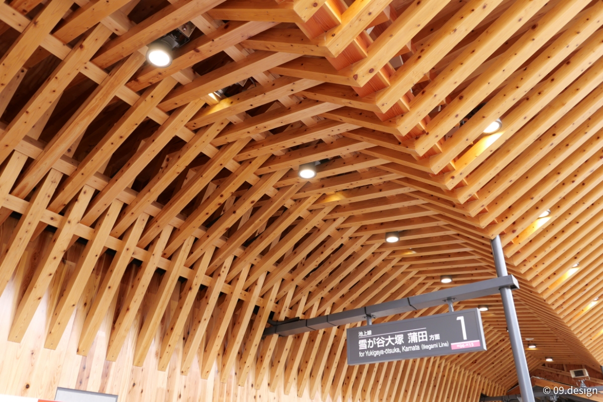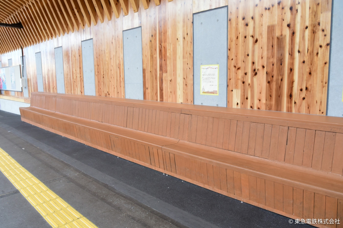 木のぬくもりを感じることができる駅として地域の皆様から愛されてきた駅を、東京都内の鉄道施設としては初めてとなる CLT(CrossLaminated Timber)を採用し、あたたかみのある駅とCO2排出削減や二酸化炭素固定化効果にも寄与するリニューアルとしました。また、木造駅施設の解体材を「古材」として再活用し、これまでお客さまとともに歩んできた駅施設の記憶を未来に継承し、ホーム上のベンチには古い木製長ベンチを復元しています。