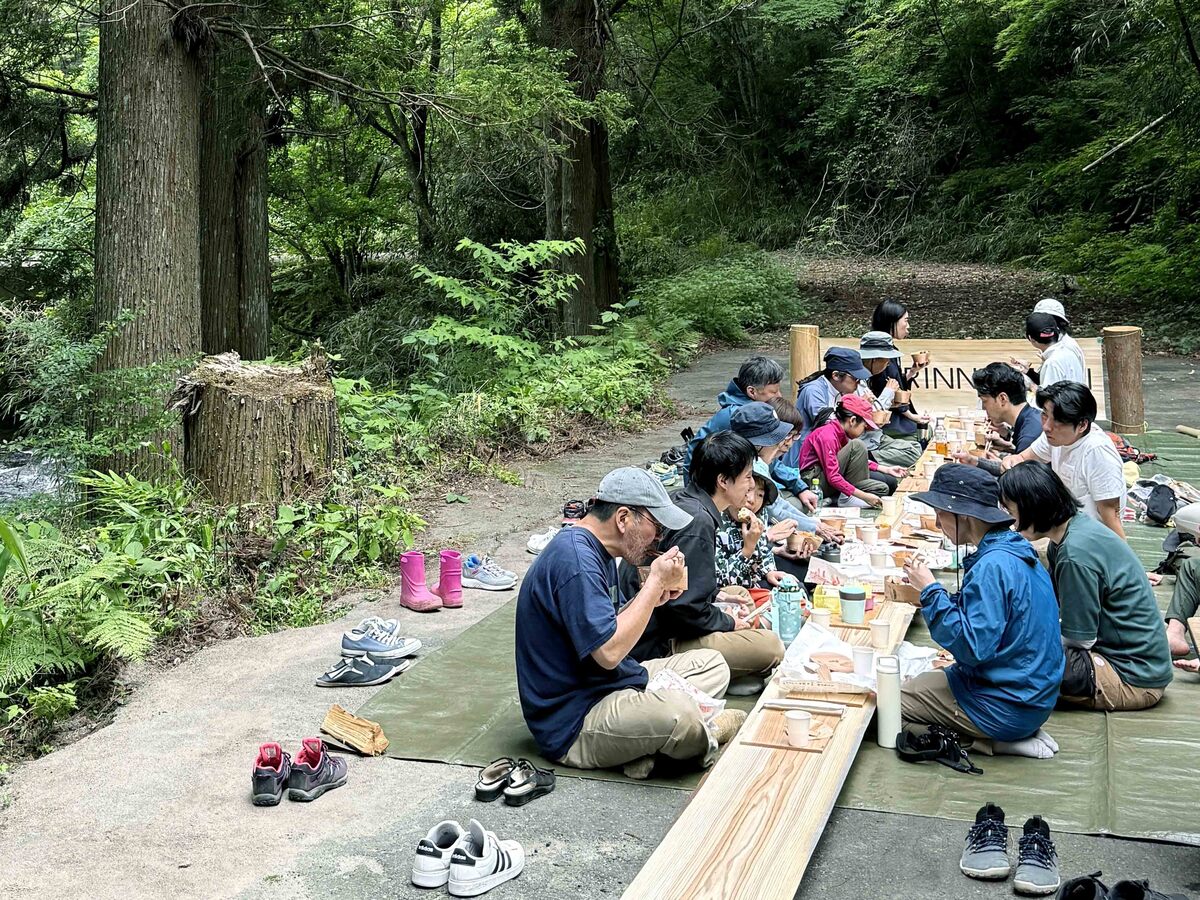日田の上津江にある森の中、以前三ツ紐伐りで伐倒した百年生の杉の木を囲んで、たべること・つくることを楽しむワークショップをおこないました。その切り株の側で、百年杉の長いテーブルを囲みながらのごはん会、お腹を満たしたその後は、食卓にした杉板を参加者の皆さんで切り分けて椅子づくりをおこないました。百年杉に触れながらその永い時に想いを馳せ、賑やかな森のひと時を過ごしました。