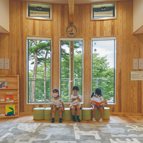 人間性を形成する幼少期だからこそ、自然との触れ合いを通じてやさしさや思いやりを育むと考えます。敷地内の森の遊歩道をこどもたちは歩きまわり、森と木と親しみ過ごします。園舎内でも木に親しんでもらいたいとの想いから、柱や梁を見せる構造としました。木材の劣化原因のひとつである直射日光や雨がかりを防ぐことと、こどもたちが歩けば自然に目にし親しめるように外廊下やテラスの軒に、CLTを採用しました。