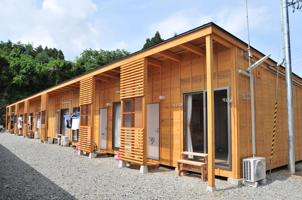 当時、被災者の住宅支援を担っていた国の機関は、応急仮設住宅を既存のプレハブ建設、災害公営住宅をコンクリート造の団地建設で計画していました。その事業の枠組みの一部(16,000戸のうち300戸)に、宮城県と登米復興住宅チームが木造によって参画する計画を立案しました。これは登米町森林組合と関係者が、木材生産から、加工、流通、設計、工事まで請け負えるサプライチェーンを構築しているため可能なプランでした。