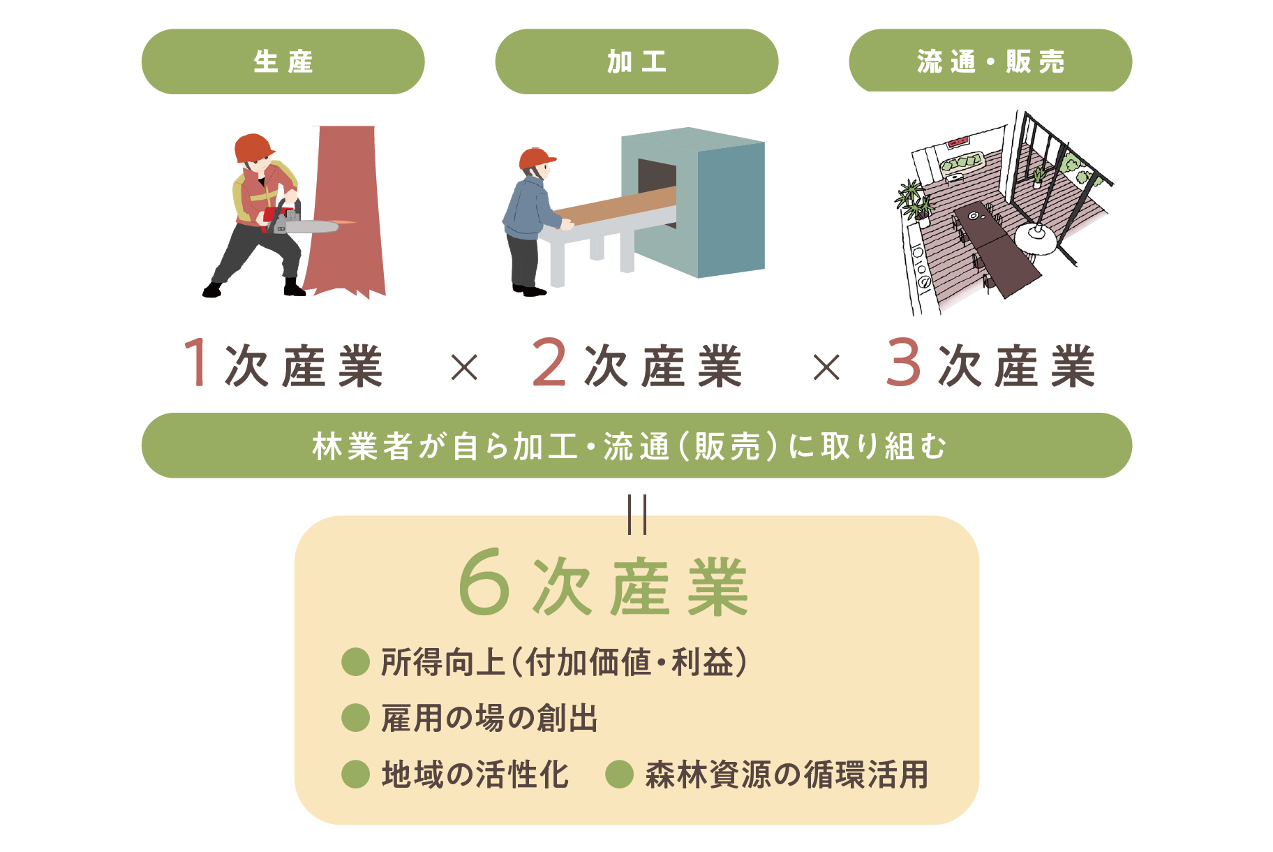 その方策の一つとして「6次産業化」があります。6次産業化とは、1次産業者が加工や販売まで担い、付加価値を高めて収益の増加と地域の活性化を図る取り組みです。農水分野では「6次産業化・地産地消法」などによる国の後押しやご当地ブームを背景に浸透していますが、林業は消費者に打ち出しづらく、産業構造的に林業家が加工・販売まで関わりにくい現状があります。