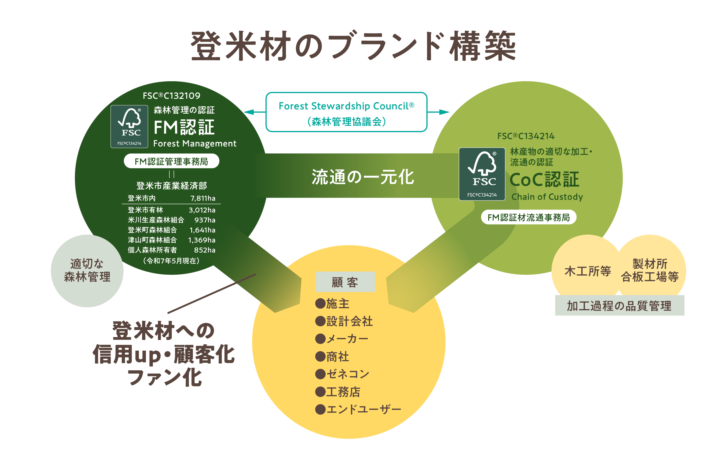 登米町森林組合は、自分たちの木材サプライチェーンの社会的意義を示すために、まず2016年に国際認証制度であるFSC森林認証の「森林管理(FM認証)」を取得しました。翌年には「加工流通過程の管理(CoC認証)」も取得し、「信頼性」「品質と加工対応力」「環境・地域貢献」といったブランドストーリーを構築することができました。