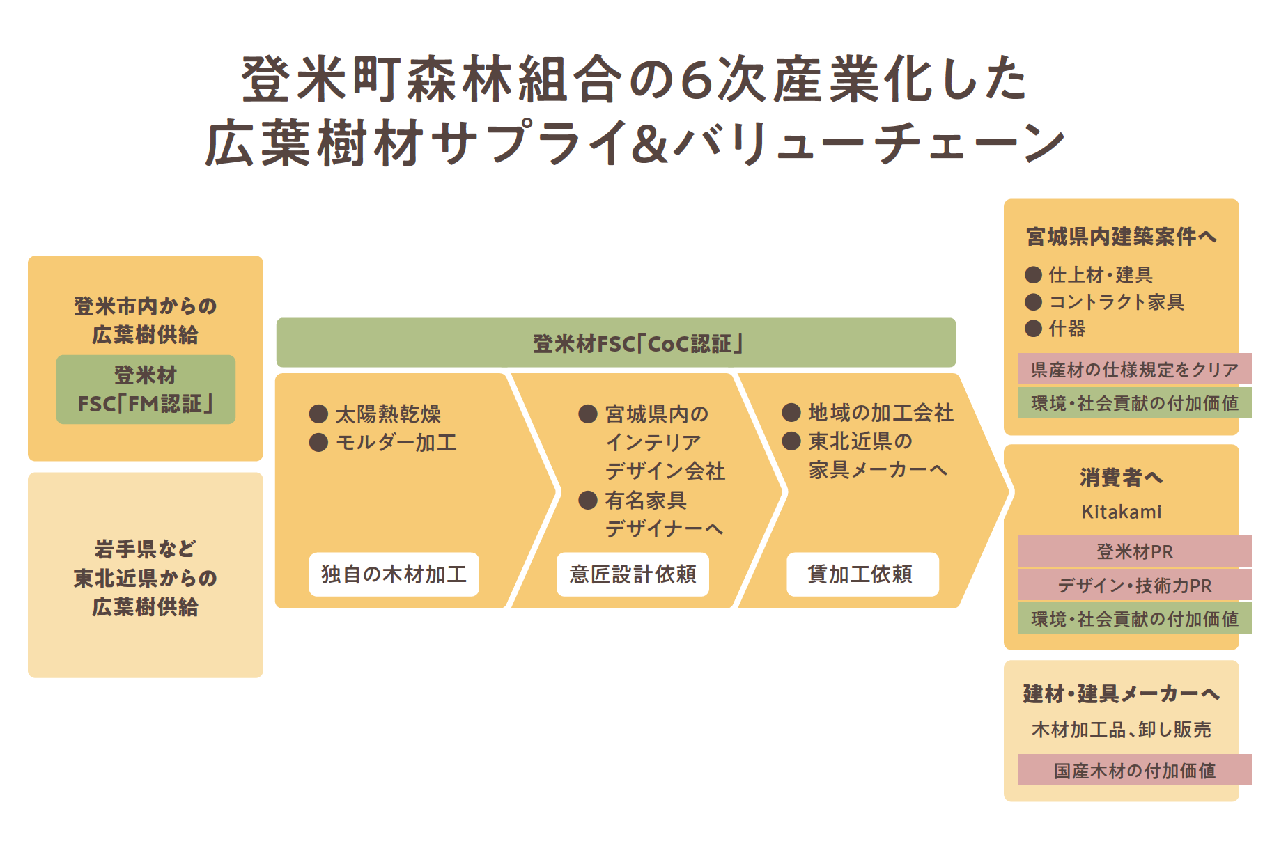 FSC認証による登米材のブランド化 第三者機関のチェックを受けるFSC認証を取得することで、森林整備や木材流通過程で信用力アップ。「登米材」のブランドストーリーづくりに寄与。